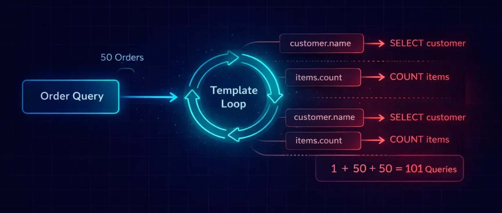 Total: 1 + 50 + 50 = 101 queries. And that’s a simple example with only two related fields. The 253-query page I mentioned had five related lookups per order.