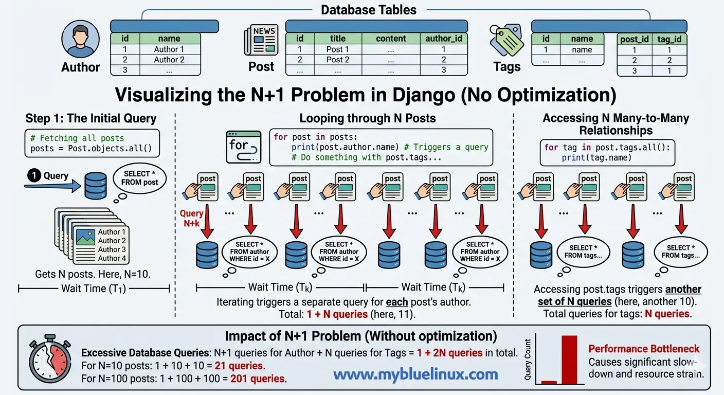 N+1 queries happen because Django’s ORM is lazy. When you access a related object, Django doesn’t fetch it until the moment you use it. This is smart for single objects but catastrophic in loops.