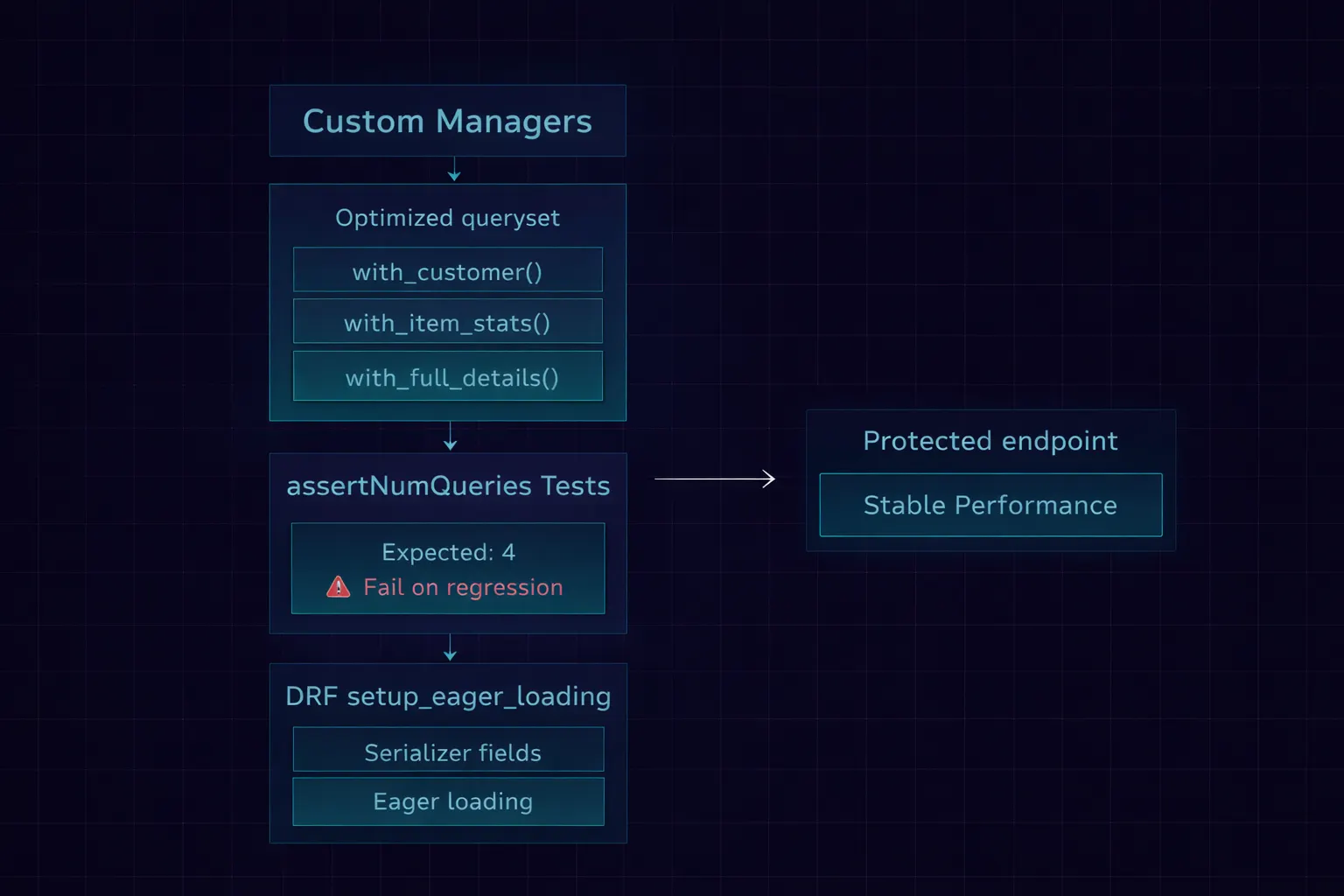When someone adds order.customer.company.name to the serializer without updating select_related, this test fails. The query count jumps from 4 to 54, the assertion fires, and the PR can't merge until the queryset is fixed.