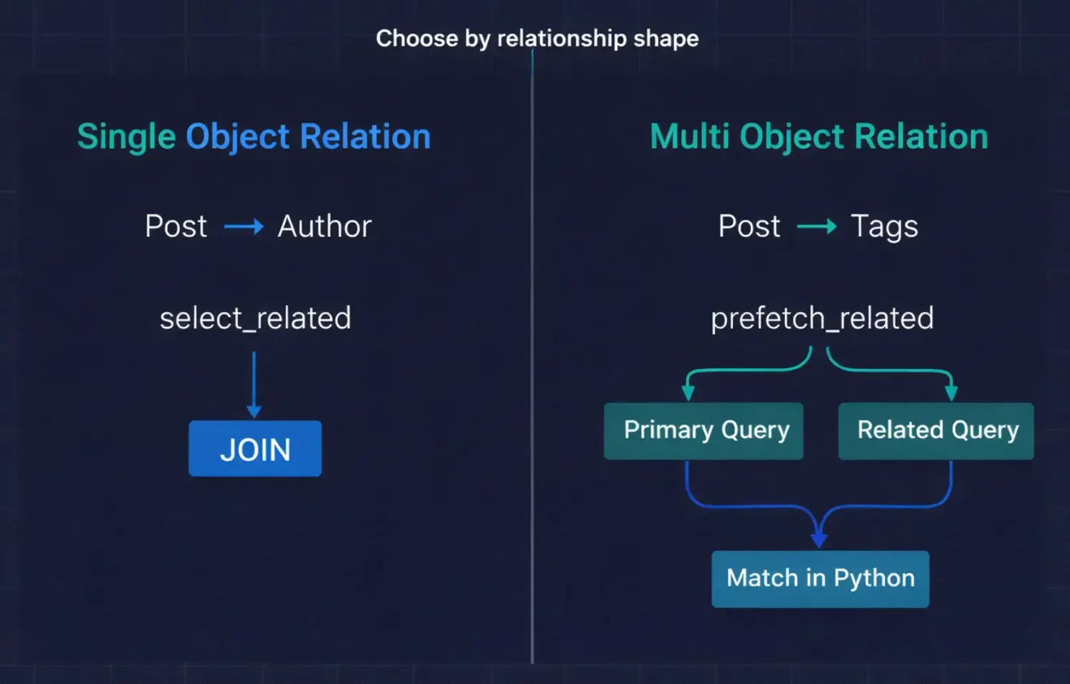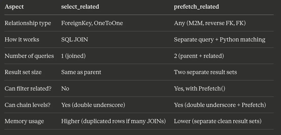 - Is the relationship a ForeignKey or OneToOneField? → Use select_related. It creates a JOIN and fetches everything in one query.
