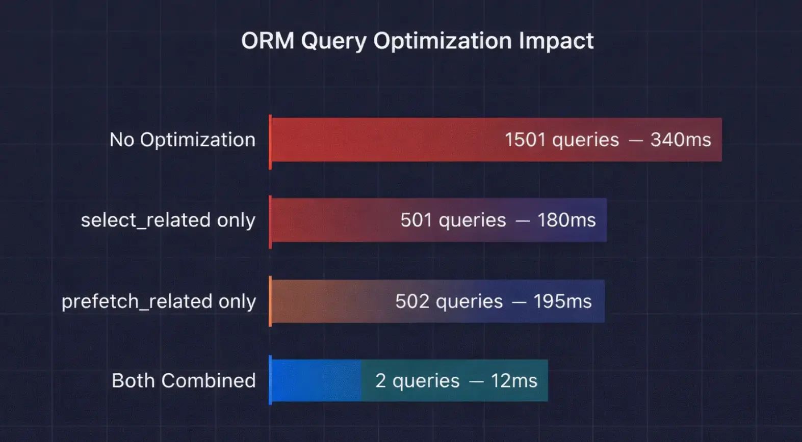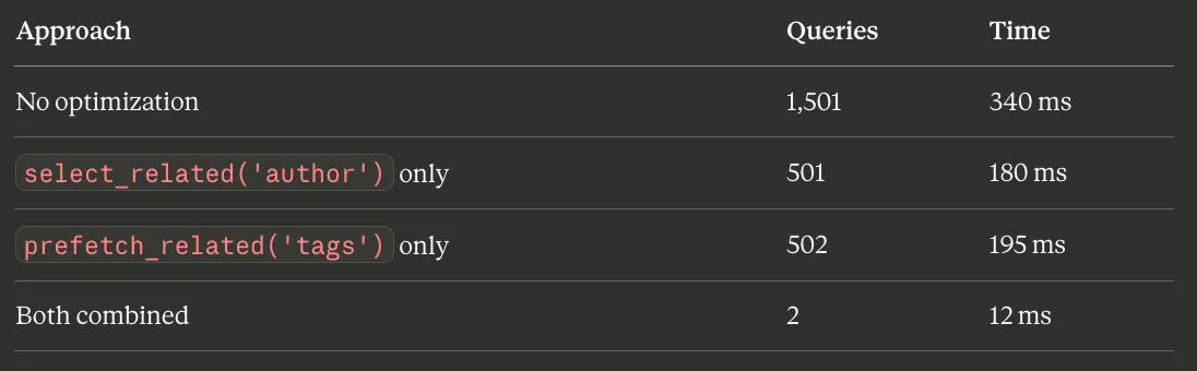 From 1,501 queries and 340ms to 2 queries and 12ms. That’s a 28x speedup from adding two method calls to the queryset. This is the highest-leverage optimization available in Django — nothing else comes close for the effort involved.
