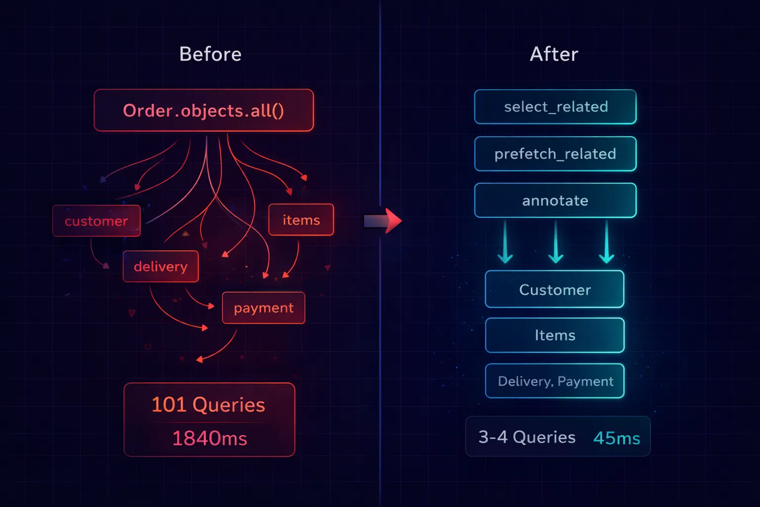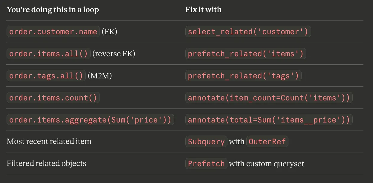 My rule for every queryset that touches a template or serializer: before you pass it to the response, check every relationship you access in the loop and make sure it’s either selected or prefetched. Django Debug Toolbar makes this trivial — if you see more than 10 queries on a list page, something needs optimizing.