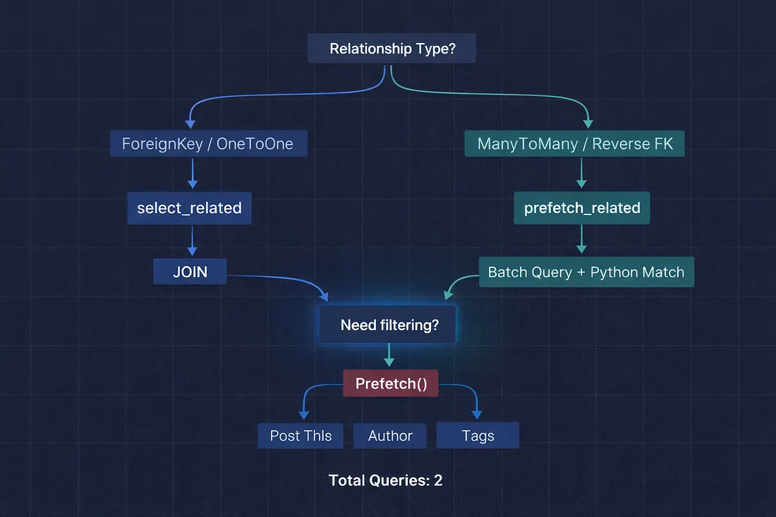 - Is the relationship a ManyToManyField or reverse ForeignKey? → Use prefetch_related. It runs a separate batch query with an IN clause.