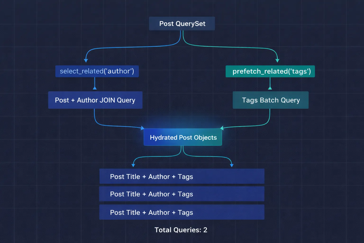 Total: 101 queries. One for posts, fifty for authors, fifty for tags. Each author and tag fetch is a separate round trip to the database. On a page with 50 posts, this takes about 120ms of pure database time — most of it wasted on connection overhead, not actual data retrieval.