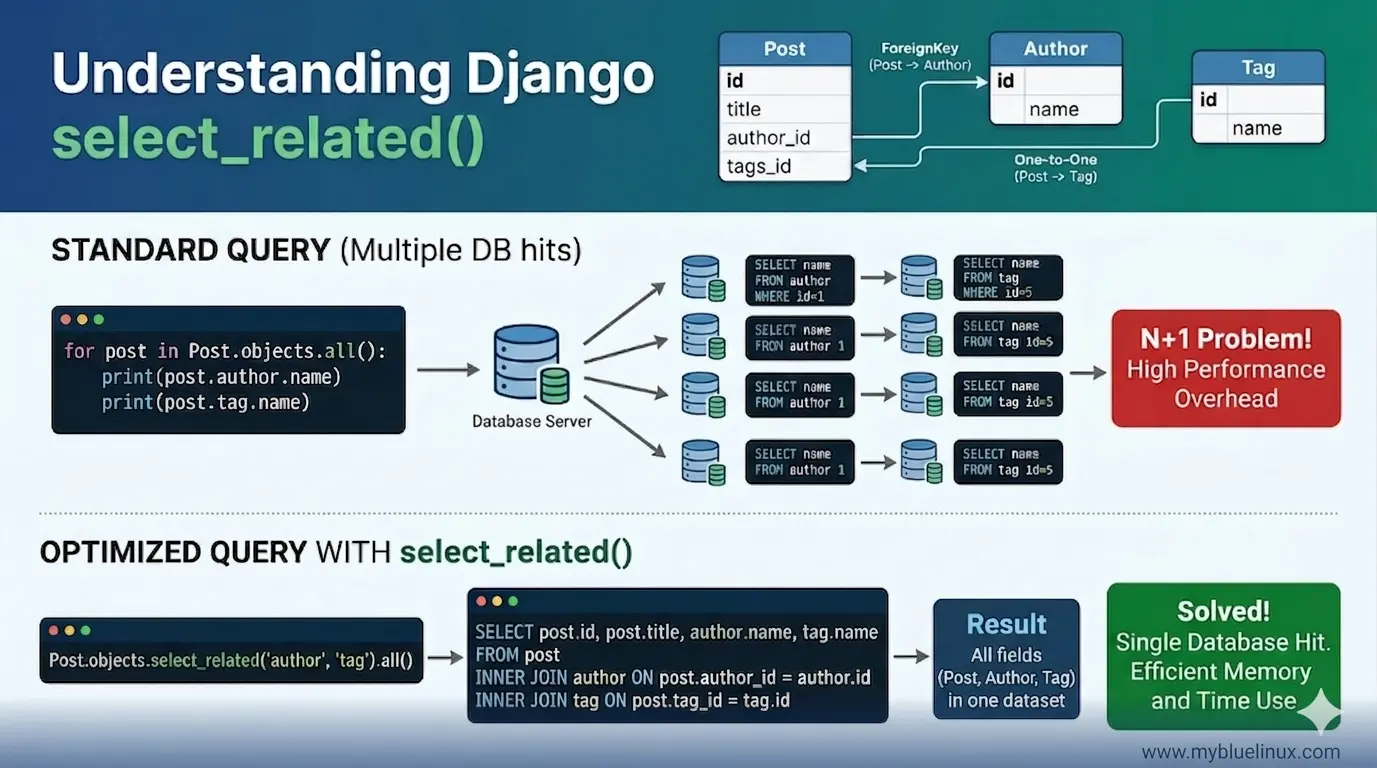Django’s ORM is lazy by default — it doesn’t fetch related data until you ask for it. This is smart for most cases but devastating when you loop through a queryset and access related objects on every iteration.