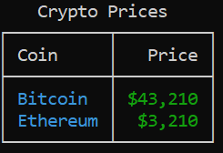 >>> table.add_row("Bitcoin", "$43,210")