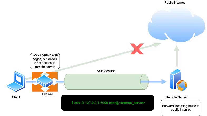 Consider the case above. The client cannot access certain web pages due to content filtering implemented in front by the firewall. But the client can connect to the remote server (via SSH), which has unrestricted access to the internet. In this case, the client can initiate ssh connection by enabling dynamic port forwarding, thus creating a SOCKS5 proxy; the client can point web browser to proxy listening on local port 6000 and access restricted web content.